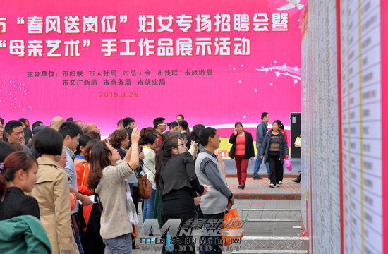 為更好地服務(wù)城鎮(zhèn)婦女就業(yè)創(chuàng)業(yè)和用人單位用工需要,昨(26)日,2015“春風(fēng)送崗位”婦女專場招聘會在人民公園拉開帷幕,190余家企事業(yè)單位提供了15158個崗位。招聘會共吸引5000余人到場求職,676人現(xiàn)場達(dá)成意向用工登記?,F(xiàn)場還舉行了“母親藝術(shù)”手工作品展示等活動。